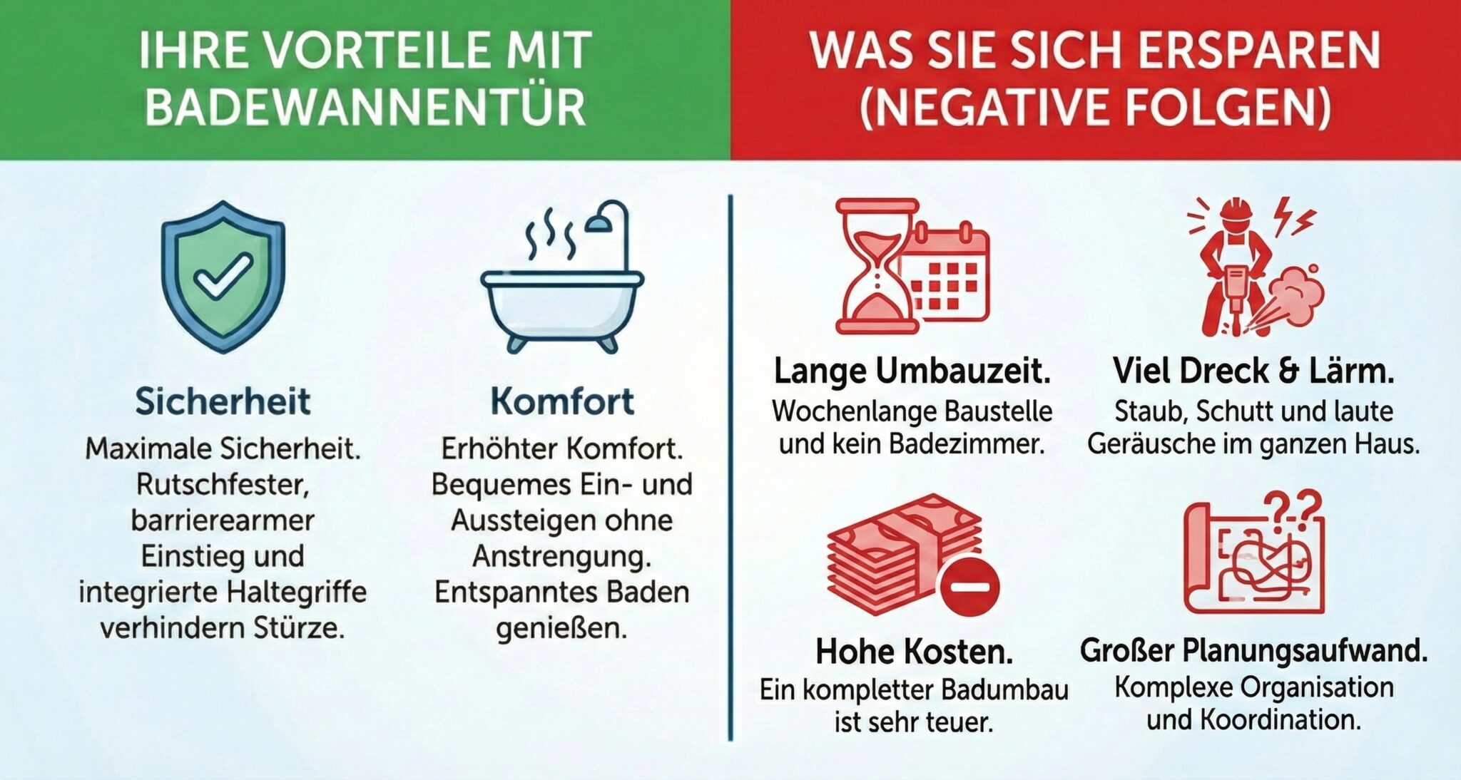 Viele Menschen empfinden den hohen Wannenrand früher oder später als Hindernis – sei es aufgrund von Alter, Bewegungseinschränkungen oder einfach für mehr Komfort im Alltag. Eine nachträglich eingebaute Badewannentür löst dieses Problem, indem sie die Einstiegshöhe dramatisch reduziert, ohne dass Sie Ihre gesamte Badlandschaft renovieren müssen.